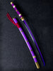 Sheathed in a rich purple hardwood saya with elegant gold and red embellishments, this handmade replica of Enma is a striking addition to any collection. The blade features a distinct patterned finish, while the hilt and handguard are accented in matching purple and gold, mirroring the powerful aura of one of Zoro’s most formidable swords minus the whole devouring your haki thing.